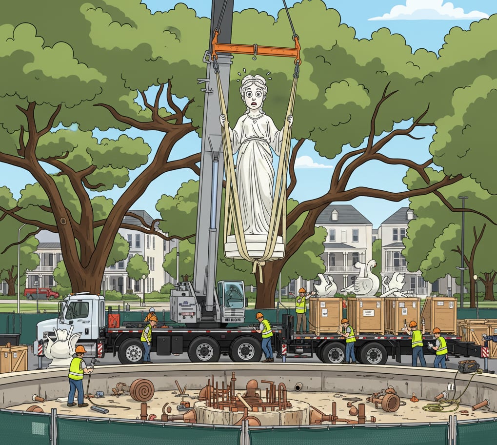 I witnessed the removal firsthand, and the logistics were staggering. It took a fleet of trucks to transport the pieces, but the most striking moment was seeing the "robed woman" statue being craned off her pedestal. The crew handled her with incredible preparation, hoisting her into the air with a gentleness that looked more like cradling a child than moving tons of metal.